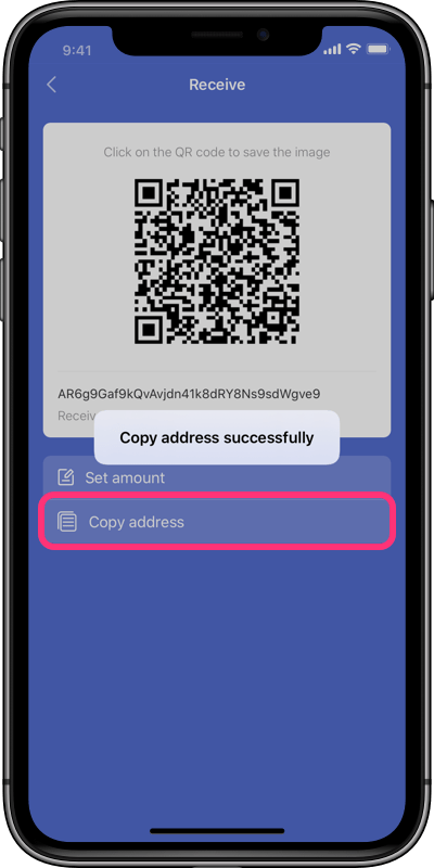 13. Click the Copy Address, and you copy the address successfully; Or you can capture a screenshot and show the QR code to the sender.