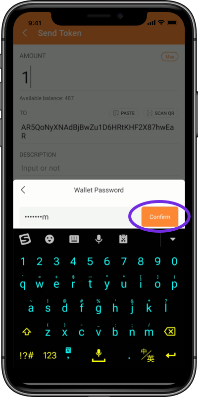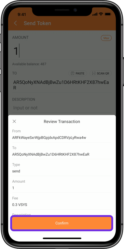 7. Input the amount, paste the Recipient Address and click Confirm;