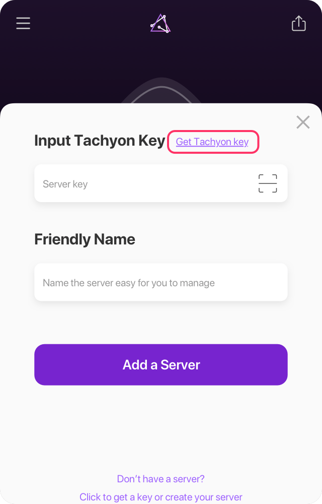 Paste Tachyon key or scan QR Code from website, and click Add a Server.