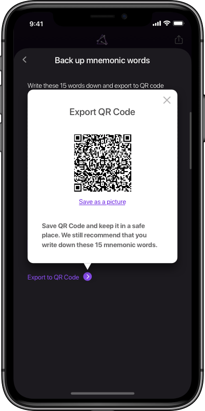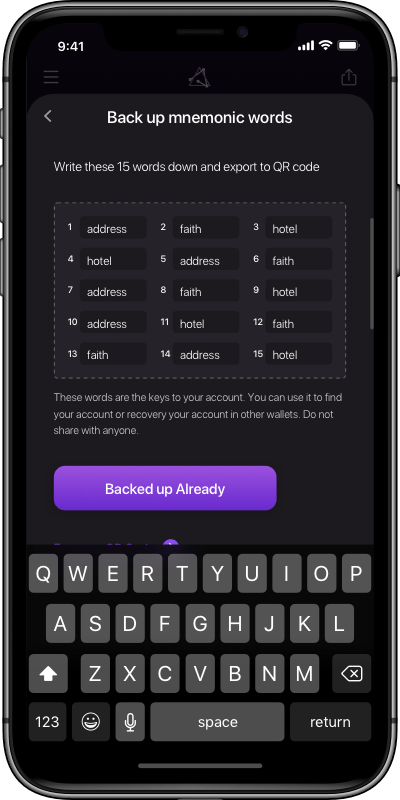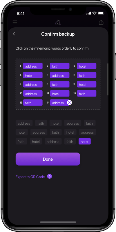 1. Input the 15 mnemonic words correctly and click the Next button;