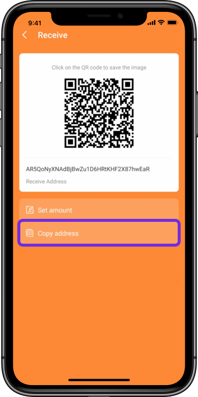 13. Click the Copy Address, and you copy the address successfully; Or you can capture a screenshot and send the QR code to the sender.