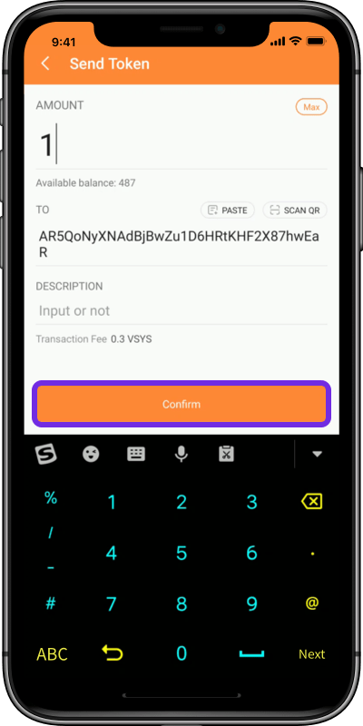 7. Input the amount, paste the Recipient Address and click Confirm;
